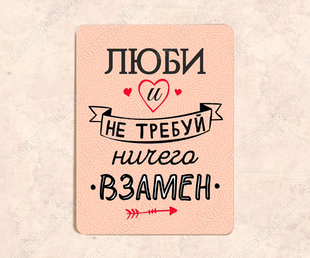 Табличка «Люби и не требуй ничего взамен» изготовлена из пластика ПВХ, толщиной 4 мм. Изображение наносится по технологии УФ-печати. Табличка предназначена для использования как в помещении, так и на улице.