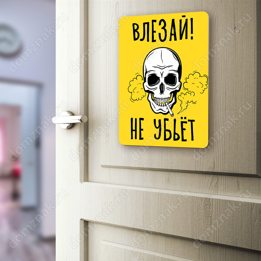 Табличка «Влезай! не убьёт!» изготовлена из пластика ПВХ, толщиной 4 мм. Изображение наносится по технологии УФ-печати. Табличка предназначена для использования как в помещении, так и на улице.
